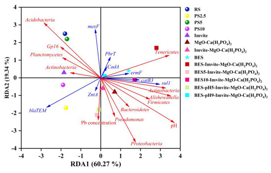 The total abundance of ARGs in BES5-Imvite-MgO-Ca(H2PO4)2 was higher than in both BES-Imvite-MgO-Ca(H2PO4)2 and BES10-Imvite-MgO-Ca(H2PO4)2 (Figure 3a). The relationships of ARGs and pH among BES-Imvite-MgO-Ca(H2PO4)2, BES5-Imvite-MgO-Ca(H2PO4)2, and BES10-Imvite-MgO-Ca(H2PO4)2 were consistent (Figure S1). ARGs resistant to sulfonamides, tetracyclines, and β-lactams exhibited the lowest relative abundance at an initial Pb concentration of 10 mg/L. Compared to BES-Imvite-MgO-Ca(H2PO4)2 and BES-pH9-Imvite-MgO-Ca(H2PO4)2, BES-pH5-Imvite-MgO-Ca(H2PO4)2 showed the highest total abundance of ARGs, particularly those associated with sulfonamides and β-lactams. In BES-pH5-Imvite-MgO-Ca(H2PO4)2, the relative abundances of ARGs such as tetA-02, tetB-02, tetD-01, aadA5-01, blaPSE, blaTEM, sul2, and mefA were the highest. Despite similar pH levels in BES-Imvite-MgO-Ca(H2PO4)2, BES-pH5-Imvite-MgO-Ca(H2PO4)2, and BES-pH9-Imvite-MgO-Ca(H2PO4)2, Pb concentrations in BES-pH5-Imvite-MgO-Ca(H2PO4)2 were lower [15]. This suggested that the lower initial pH may be responsible for the elevated ARGs abundance in BES-pH5-Imvite-MgO-Ca(H2PO4)2.