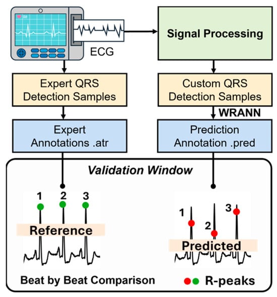 The primary purpose of R-peak detectors is to predict R-peak time location. The window concept is essential for evaluating time location and is considered the foundation of all WFDB tools. It plays a critical role in validating the robustness of every R-peak detection methodology. It allows for the comparison of WRANN-generated annotations (based on predicted peaks) with manually edited reference annotations marked by a cardiologist, using the benchmark window size of 0.15 s [81]. This helps distinguish false peaks from true R-peaks. Using this standard, two R-waves are considered matching if their labels are, at most, 0.15 s apart [82]. This precise comparison ensures not only the accurate diagnosis of arrhythmia but also can be used for applications like heart rate variability (HRV) [16], fetal heart rate monitoring (fHRM) [83], and biometric recognition [84].