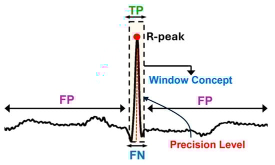 Figure 3 illustrates the basic working of the window and how metrics like TP, FP, and FN are measured. We can also use other metrics to evaluate the detector based on TP, FP, and FN. These metrics are positive predictability (+P), accuracy (Acc), and the detection error rate (DER) [36,86,87]. Each of these evaluation metrics is defined as follows: