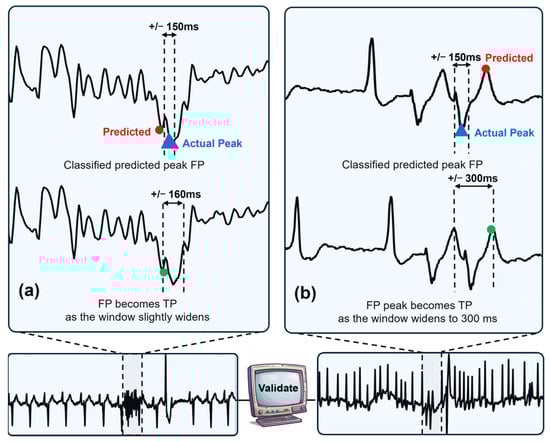 Another issue observed in the literature is the ambiguity of the acceptable window tolerance. Online WFDB documentations mention a window of 150 ms or 0.15 s without specifying the acceptable ± tolerance range, whether it is ±75 ms [44] or ±150 ms [30], as shown in Figure 5a. There is further confusion about whether the WFDB R-peak validation tools use exact ±75, ±150 sample values or any other sample limits. Online resources typically indicate a window size of 0.15 s, but R-peak validation is usually conducted on samples. Therefore, the time unit must be converted first into samples as