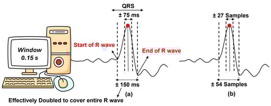 where Fs is the sampling frequency of the validated dataset. For the MIT-BIH arrhythmia database with sampling frequency of 360 Hz, a ±150 ms window corresponds to ±54 samples, and a ±75 ms window corresponds to ±27 samples, as shown in Figure 5b.
