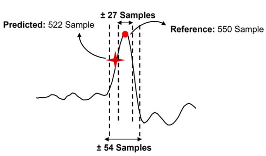4: During validation, check for FNs and FPs. If they are reported, the allowable tolerance for the benchmark of 150 ms is ±75 ms or ±27 samples, as shown in Figure 6, because our predicted sample exceeds the window size by ±1 sample. If FNs and FPs are not reported, then the allowable tolerance would be ±54 samples for a 150 ms window, which is equivalent to a ±150 millisecond tolerance.