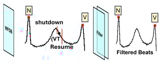 Here, the WFDB comparator’s general working is shown to illustrate how it processes the actual beats of normal (N) and premature ventricular contraction (V) beats but excludes a non-beat ventricular tachycardia (VT) using the shutdown and resume time mechanism. Shutdown is the time when excluded parts consisting of non-beats start and resume is the time when these parts end. The literature, such as [45,46,47] and many others as given in Table 1, does not provide the details of the employed R-peak validation procedures. Although these studies provide statistical metrics, it is reasonable to assume that they used custom validation methods for testing R-peaks that raise a question about how they addressed the non-beat issue, as simply adjusting the window size is insufficient to ensure accurate statistical outcomes. In contrast, WFDB R-peak validation tools filter out non-beats, highlighting the importance of a standard R-peak validation method to tackle these issues effectively.