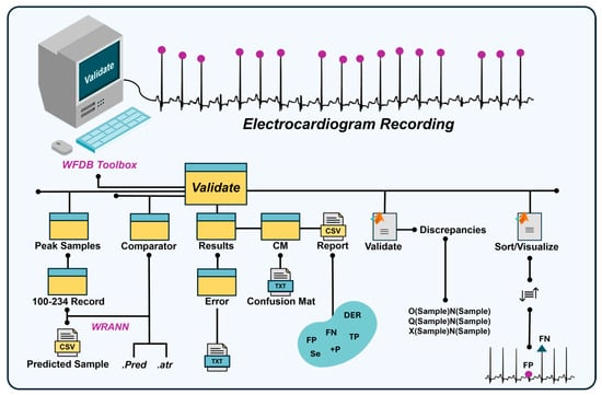 Compared to the other tools, bxb is more often used for ECG R-peak validation because it was specifically designed to compare predicted and reference annotation markings beat-by-beat [80], as shown in Figure 2. However, due to scattered and unclear information regarding these tools within the PhysioNet database, and lack of comprehensive guidance in the available literature, a detailed guide is needed to integrate WFDB tools and implement additional validation pipelines (series of steps or processes). These pipelines include tool integration, simultaneous testing of all records, generation of validation statistics, error reports, extraction of FP and FN, and their accurate visualization in the reference signal [23].