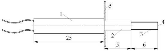 Design of single-thread constant-temperature hot-wire anemometer sensor for determining air flow velocity: 1—sensor base; 2—ceramic insert; 3—conductive holder; 4—thread (sensitive element); and 5—vertical diffuser.
