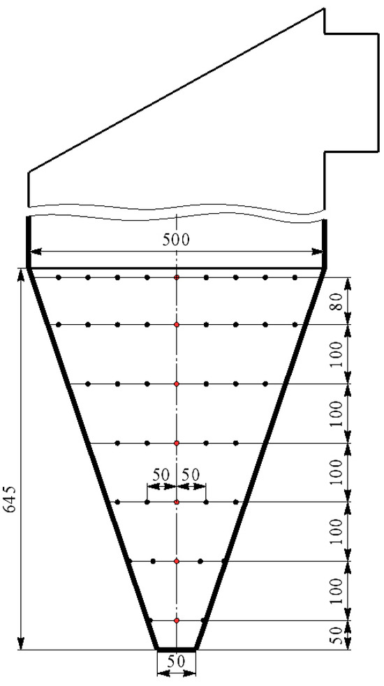 The installation locations of the hot-wire anemometer sensors for measuring the air flow velocity in the diffuser are shown in Figure 5. The measurements were carried out in the diffuser section of the experimental setup (Figure 5). The first control section for height was located at a height of h = 50 mm from the inlet section of the diffuser. The distance between the sensors was l = 32 mm in this section. The distance between the sensors along the width of the diffuser starting from a height of 150 mm was l = 50 mm and the step in height was h = 100 mm. The distance from the extreme point to the wall was 10 mm at heights of h = 50 mm; 150 mm; 250 mm; 350 mm; and 550 mm (not shown in the diagram).
