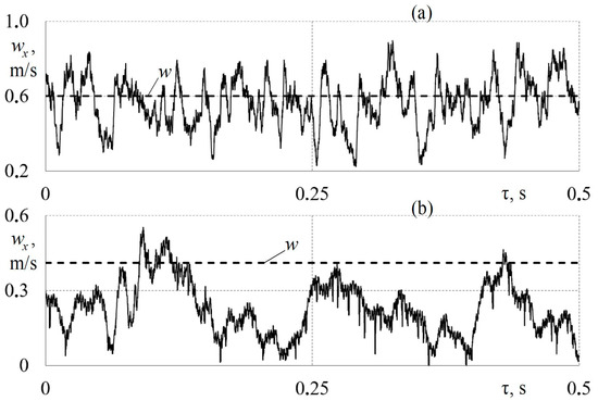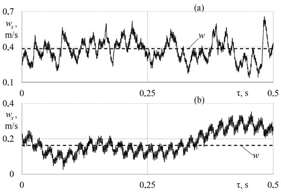 Dependences of instantaneous values of flow velocity wx on time τ for initial wo = 2.22 m/s in a vertical conical diffuser at different heights h (along diffuser axis): (a) h = 150 mm and (b) h = 450 mm (w is average flow velocity at measured point).