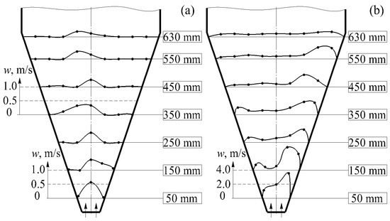 The velocity fields w were obtained by averaging the instantaneous values of wx at each measurement point and the velocity fields in the vertical diffuser were obtained for different initial velocities to assess the evolution of the flow structure under different boundary conditions (Figure 8).