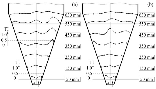 The flow turbulence intensity TI was calculated at each measurement point based on the instantaneous velocity data wx and the TI fields in the vertical diffuser were obtained based on these calculations (Figure 9).