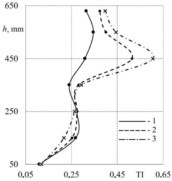 The dependences of the change in TI along the height of the studied vertical diffuser along its axis for different initial flow velocities were obtained to analyze more detailed information about the gas-dynamic characteristics of the flow (Figure 10).