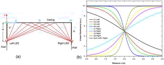 In the 2D model, as illustrated in Figure 2a, the linear illuminance along the ceiling line x is generated by light sources positioned on both the right (R) and left (L) sides. The expressions for the linear illuminance from these sources are defined as follows:
