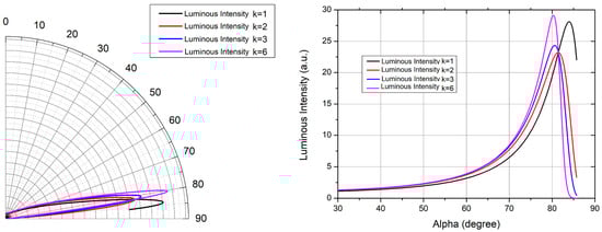 In Figure 3, the luminous intensity curves D(θ) are depicted, having been calculated based on the E(x) for various values of k (where k = 1, 2, 3, 6), utilizing Formulas (2)–(5). It is observed that the maximum of the luminous intensity curves varies between 80° and 84°. For k = 1 and k = 2, the maximum angle, corresponding to the end of the ceiling, is determined to be 86°; hence, luminous intensity values are not obtained for larger angles.