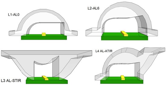 To demonstrate the merits of the design methodology grounded on ideal luminous distribution curves, four distinct AL–TIR LED luminaire configurations, as depicted in Figure 4, were evaluated. The L1–AL0 luminaire, developed empirically prior to the formulation of ideal luminous intensity curves, serves as a foundational reference. In contrast, the L2–AL6 luminaire, conceptualized with the ideal luminous intensity curves in mind, showcased improved light beam utilization, albeit not fully optimized due to the absence of TIR optics. The lens profiles of L2–AL6, observed in the section perpendicular to the lens axis, exhibit an asymmetric shape. It consists of a semi-circular arc on the exterior, transitioning into linear segments to form the asymmetry, while the interior cross-section is segmented into distinct subsections, crafting a composite lens with convergent, divergent, and non-refractive zones. The precise placement of a thin LED strip at the lens’ center, at variable distances, and the subsequent selection of configurations based on maximum intensity in the luminous intensity plot ensured optimal lighting distribution.
