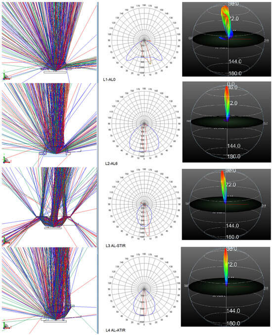 Photometric analysis of luminaires L1–AL0, L2–AL6, L3–AL STIR, and L4–AL ATIR. (Left) Ray tracing visualization with RGB light rays illustrating the directional spread of light for each design. (Middle) Polar luminous intensity distribution plots showing angle-based light intensity variation, revealing beam shape and spread. (Right) 3D polar distribution maps depicting spatial intensity in color-coded format, highlighting regions of high and low intensity. These visualizations enable comparison of each luminaire’s light distribution characteristics, including directionality, uniformity, and intensity control.
