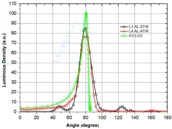 From the graph, it is noticeable that both the L3 AL–STIR and L4 AL–ATIR luminaires exhibit peak lighting intensities that are slightly lower than the peak of the ideal K3 LOG curve. This subtle deviation indicates a marginally reduced luminous intensity at the angle of maximum emission when compared to the theoretical optimum modeled by the K3 LOG curve. The inclusion of TIR elements in the luminaire designs, as indicated by the AL–STIR and AL–ATIR nomenclature, appears to have contributed to an improved luminous intensity distribution, drawing it closer to the ideal curve’s distribution.