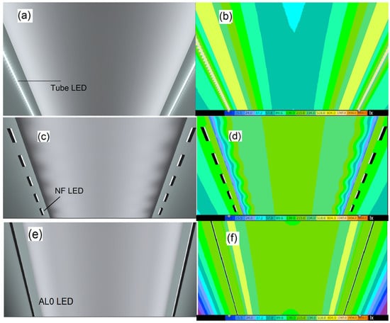 Three-dimensional renderings and illuminance color maps of advanced AL LED luminaires demonstrating their impact on ceiling illumination: (a,b) AL6 LED configuration provides a uniformity  of 0.78, depicting efficient light distribution; (c,d) AL–STIR LED setup, achieving a uniformity  of 0.63, combines optics for balanced illumination; (e,f) AL–ATIR LED arrangement reaches the highest uniformity  of 0.83, showcasing optimal uniformity and intensity control across the ceiling.
