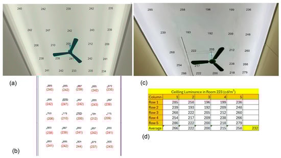 Comparison of simulated and actual ceiling luminance: (a) simulated ceiling image with calculated luminance values; (b) detailed luminance values with corresponding illuminance; (c) real ceiling image with measured luminance; (d) tabulated luminance measurements across a grid in Room 223, illustrating the correlation between simulation and reality, validating the luminaire design process.