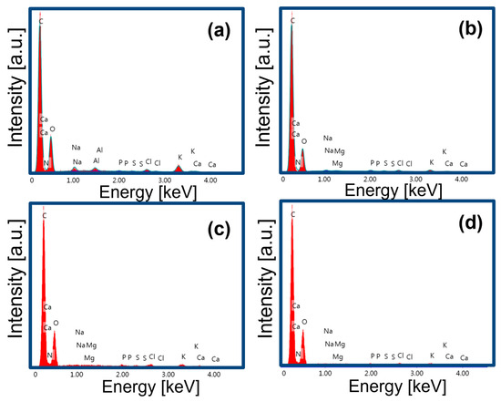 A scanning electron microscope (SEM) (Quanta 450, FEI, Thermo Fisher Scientific, Hillsboro, OR, USA) with an energy-dispersive X-ray detector (EDS) (EDAX, AMETEK Inc., Berwyn, PA, USA) was used to describe the morphological characterizations of the products. The EDS spectra study was undertaken using the TEAM version V4.1 system made by EDAX Inc. As a standard, an AlCu sample made of copper foil on an aluminum grid was used for calibration before the study. The samples were studied in a low-vacuum environment with a pressure of about 6.1 × 10−4 Pa. The acceleration voltage of the electrons was 15 kV, and the images were examined at a 500× (10 μm) magnification.