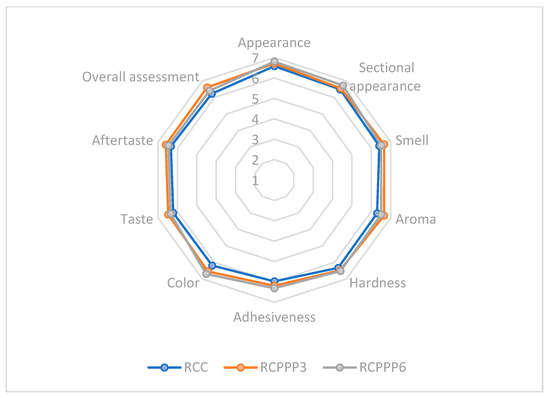 Comparative diagram of the sensory attributes specific to PPP-supplemented cheeses. RCC: cheese without powder addition; RCPPP3 and RCPPP6: cheese with 3 and 6% PPP.