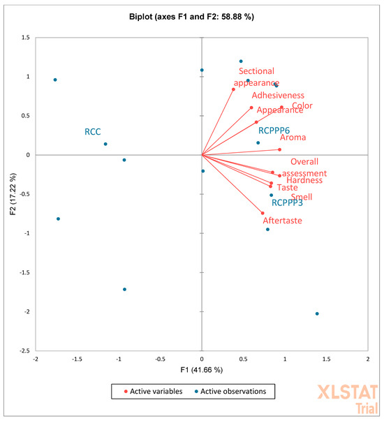 Principal Component Analysis (PCA) biplot of the position of the three cheeses (RCC, RCPPP3, and RCPPP6) for sensory attribute evaluation.