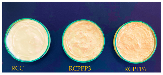 The color parameter research indicates that the inclusion of PPP substantially influenced the cheeses’ color. The cheeses that were subjected to experimentation exhibited the highest values of yellowness (b*) and redness (a*) and the lowest values of lightness (L*). In fact, the PPP-enhanced cheese had a darker appearance compared to cheese without powder addition, as indicated by lower L* values. Indeed, a high decrease in the L* value from 94.60 ± 0.36 (RCC) to 80.27 ± 0.36 in RCPPP6 prepared with PPP was observed. Therefore, the lightness (L*) value was reduced with the increase of PPP in the enriched cheeses.