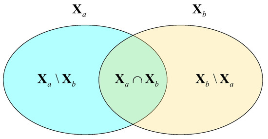 As shown in Figure 1, the targets detected by the two sensors a and b are denoted as , . The overlapping field of view of the sensors a and b is shown in the green part, and the unique FOVs are shown in blue and yellow, respectively. denotes the removal of the targets in from the targets in , and indicates the targets that are common to both and .