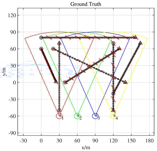 In this section, we verify the effectiveness of the proposed algorithm through simulation experiments. The experimental scene is shown in Figure 3. Four identical sensors, -, were evenly spaced in a straight line, and each sensor had a maximum detection distance of 150 m. The detection range was centered on itself, directly in front of a fan-shaped area with an angle of , and there were red, green, blue, and yellow contour lines inside. There were several overlapping areas between the detection ranges of the sensors. More than one sensor could detect the targets in the overlapping regions. Each sensor could only detect the targets within its detection range but could not obtain them outside the detection area. There were seven group targets in the scene. Each group target moved with a uniform linear motion, with the measurement rate and the extended profile remaining relatively unchanged. The state transfer equations that characterize the process are as follows: