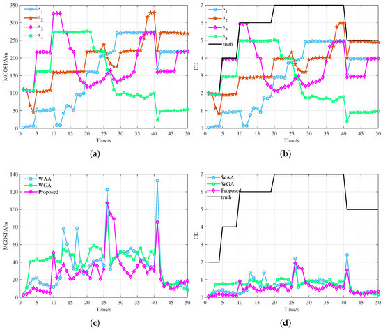 Tracking results for . (a) Individual sensors’ MGOSPA error without fusion. (b) Individual sensors’ CE results without fusion. (c) MGOSPA results with fusion. (d) CE results with fusion.