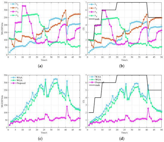 In Figure 5a, it can be seen that the single sensor still obtained extensive MGOSPA results, which was still because the limited view could not be used to track all the targets. After fusion, the three fusion methods had a significant decrease compared with the single sensor (see Figure 5c). However, the WAA and WGA methods still had relatively large MGOSPA and CE results, which was related to the clutter number. With the increase in the clutter number, WGA and WAA were prone to producing erroneous fusion results, while the proposed method was less affected by the clutter number than these two, and it was slightly improved compared with that when .