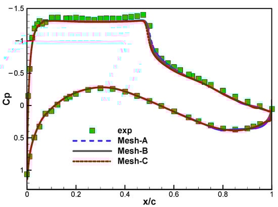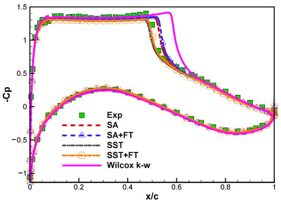 The surface pressure distributions obtained from different turbulence models are compared in Figure 4, including the S-A model, the SST model, and the k-ω model. The shock wave occurred at x/c ≈ 0.50 in the experiment. Comparing the performance of the three models, the SST model predicted the shock wave position being in good agreement with the experiment; The S-A model was slightly downstream, while the Wilcox k-ω model deviated significantly from the experiment, placing the shock wave at x/c ≈ 0.57, noticeably further downstream. Since transition strips were applied at 7% chordwise positions on both the upper and lower surfaces of the airfoil in the experiment, we further compared the impact of adding a fixed transition (FT) into the computational results. Compared to full-turbulence simulation, the shock wave positions predicted with the S-A model and SST model are slightly advanced when a fixed transition is added. To better simulate the experimental conditions in unsteady simulation, a fixed transition was added at the corresponding positions in subsequent calculations in this section.