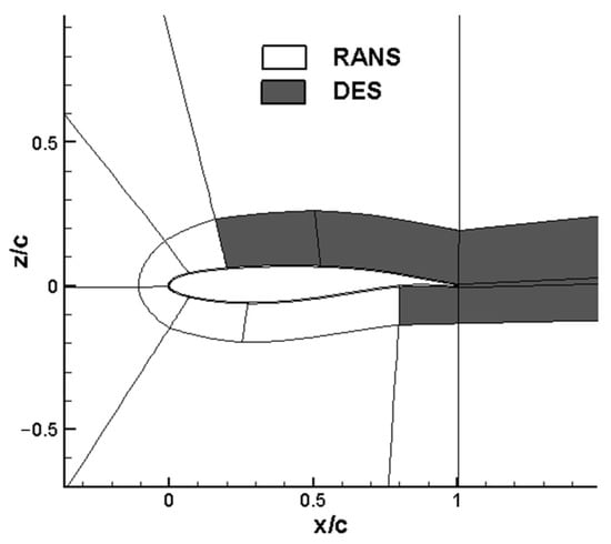 The computational domain for the ZDES of OAT15A is shown in Figure 5, where DES was applied to the upper surface and wake region prone to transonic shock buffet, while the rest of the domain utilized RANS. The time step for the unsteady simulation was set to 1 × 10−6 s, with 15 sub-iterations performed within each time step, which depends on a Courant–Friedrichs–Lewy number based on acoustic velocity and spanwise grid spacing of less than one.