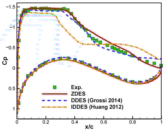 Figure 6 presents the time and spanwise averaged pressure coefficient distribution. On the upper wing surface, the IDDES predicted an average shock wave position located at around x/c = 0.25, which is approximately one-third ahead of the experimentally observed average shock wave position. The average shock wave position obtained with DDES was slightly closer to the upstream, and the pressure distribution in the trailing edge region was noticeably lower than the experimental results. In comparison, the average shock wave position predicted by ZDES in this study were essentially consistent with the experimental results. During the oscillation of the shock wave, the flow on the lower surface remained attached, and both global and zonal DES provided pressure distribution results consistent with the experiment.