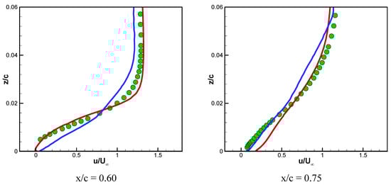 The streamwise velocity distributions obtained with DDES and ZDES at different positions are compared in Figure 7. At the x/c = 0.28 location, which was at the upstream position of the shock wave, the flow remained attached, and both the DDES and ZDES velocity distributions agree well with the measured results. At the x/c = 0.45 location, near the average position of the shock wave, the ZDES result predicted a velocity distribution in agreement with the experimental results. However, the DDES yielded a thicker boundary layer and lower velocities outside the boundary layer, due to the predicted advance of the average shock wave position by the DDES. This also led to slight discrepancies between the DDES and the experiment at the x/c = 0.60 and x/c = 0.75 locations. Overall, the streamwise velocity distribution obtained with ZDES better matched the experimental results.