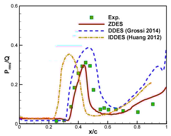 Root-mean-square distribution of pressure fluctuations on the upper surface of the airfoil; Grossi 2014 [11], Huang 2012 [12].