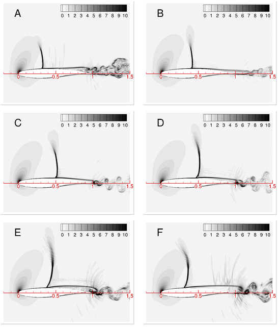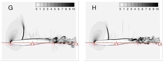 Density gradient contours are presented in Figure 10 at selected instants in time. At the initial moment A, the shock wave was positioned at an approximately 30% chordwise location. At moment B, the shock wave moved downstream to around a 40% chordwise position, reaching the furthest downstream position at moment C, at an approximately 50% chordwise location. At moment D, there was no significant difference in the shock wave position compared to moment C, but the tilt angle of the shock wave increased, and small-scale high-frequency fluctuations in the lift coefficient began to appear. By moment E, the shock wave has started moving upstream and reaches x/c = 0.37. At moment F, the shock wave was positioned at x/c = 0.30, until moment G when the shock wave reached the furthest upstream position (x/c = 0.23). Subsequently, the shock wave began to move downstream again, reaching the initial position at moment H, marking the completion of one cycle.