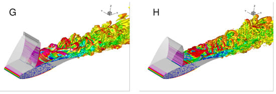 Figure 11 displays the iso-surfaces of the Q criterion in one cycle. The shock wave induced separation in the downstream boundary layer, and the shear layer exhibited strong two-dimensional characteristics. As it progressed downstream, the shear layer gradually breaks into small-scale three-dimensional turbulence structures, and some large-scale vortex shedding can be observed in the downstream wake region. Comparing the instantaneous flow at different moments revealed that the separation region induced by the shock wave undergoes periodic variations as the shock wave moves. During the downstream movement of the shock wave (from A to C), the separation region behind the shock wave gradually thinned, and the size decreased, resulting in an increase in lift. Conversely, during the upward movement of the shock wave (from E to G), the separated boundary layer thickened, and the separation region gradually enlarged, leading to a decrease in the lift coefficient. It is noteworthy that the lift coefficient did not reach its maximum peak when the shock wave reached the furthest downstream position. Combining Figure 10 and Figure 11, it could be observed that the vortex structures of different scales at the trailing edge generated strong fluctuations.