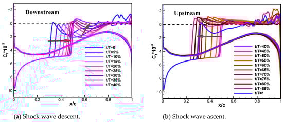 The distribution of the average friction coefficient on the wing surface at different instants is illustrated in Figure 12. The surface friction coefficient can reflect the flow separation status after the shock wave. During the shock wave downward motion, as the shock wave traveled from the upstream (t/T = 0) to the most downstream position (t/T = 40%), the separation region on the upper wing surface gradually approached the shock wave location until the entire surface was separated. During the shock wave upward motion, the upper wing surface was in a mostly separated state from the shock wave location to the trailing edge until the end of the upward motion.