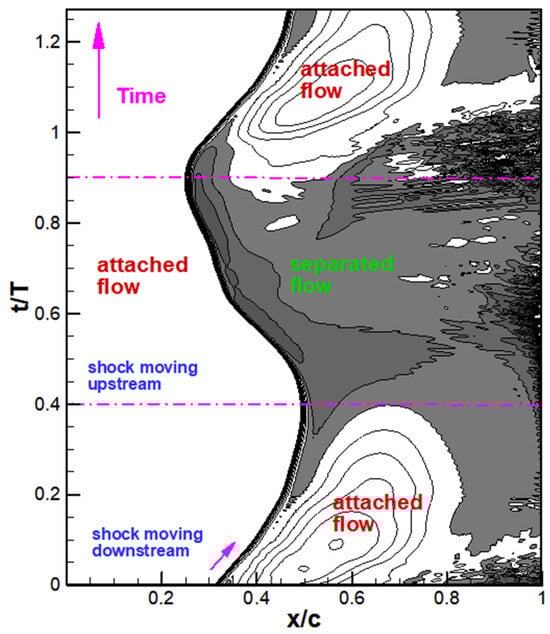 Figure 13 depicts the temporal and spatial variations in flow separation and reattachment on the upper surface of the airfoil based on the distribution of the friction coefficients. The vertical axis represents the progression of time, which is dimensionless with respect to the transonic shock buffet period T, corresponding to the global time shown in Figure 9. The horizontal axis represents the streamwise position on the upper surface of the airfoil (x/c = 0 for the leading edge, 1 for the trailing edge). The white region indicates the attached flow, while the dark region represents the separated flow. The figure clearly reflects the changing positions of the shock wave and flow separation regions over time. At the initial instant (t = 0), the shock wave was in the downward phase. Local separation appeared in the trailing-edge region, while the flow in other areas remained fully attached. As the shock wave further moved downstream, separation bubbles occurred simultaneously at the base of the shock wave and in the trailing-edge region. When reaching the most downstream position, these two separation regions converged, leading to complete separation on the upper surface after the shock wave. During the upward motion of the shock wave, the region behind the wave remained fully separated until the shock wave approached the most upstream position. At this point, the separation region divided into two parts again. As the shock wave moved downstream once more, these two regions gradually shrank, then expanded again, repeating the cycle. Although the results presented here represent only one cycle of flow separation, the flow separation patterns in other cycles were qualitatively consistent, with potential quantitative differences.