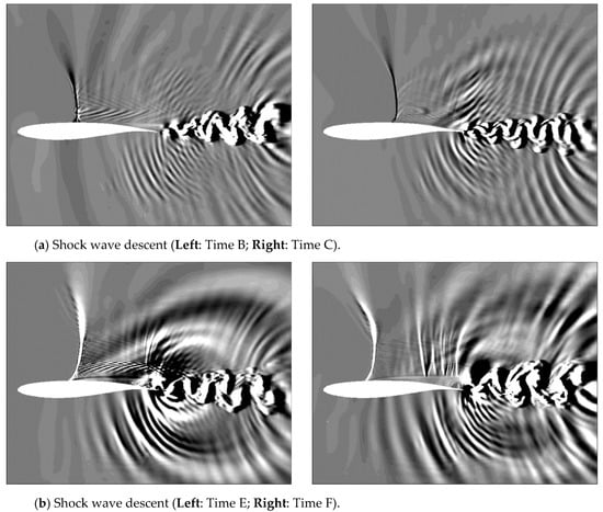 Figure 14 illustrates the instantaneous wave field of the transonic shock buffet at different moments. During the downstream movement of the shock wave, the instability at the trailing edge is relatively weak. At this point, the pressure wave generated by the trailing edge is not enough to push the shock wave upstream. The shock wave-induced separation also caused the instability of the boundary layer to propagate downstream with the movement of the shock wave. When the disturbance reached the trailing edge, the instability of the trailing edge increased, and the strength of the pressure waves radiating upstream also intensified, initiating the upstream movement of the shock wave. During the downstream movement of the shock wave (as shown in Figure 14b), as the distance from the shock wave position to the trailing edge continuously increased, the disturbance of the boundary layer instability at the trailing edge diminished. Consequently, the strength of the pressure waves radiating upstream weakened, leading to the shock wave starting to move downstream again. This resulted in the periodic oscillatory motion of the shock wave on the upper wing surface.
