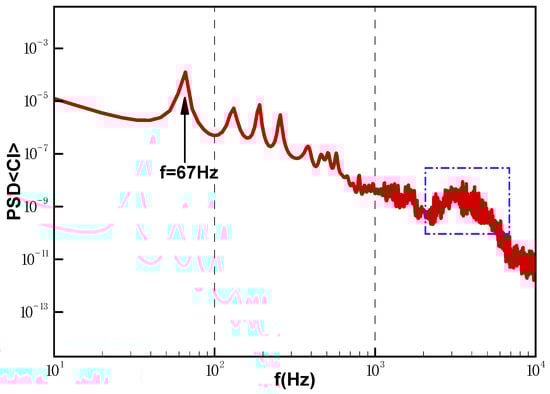 The power spectral density (PSD) of the lift coefficient obtained with the parameter autoregressive method is shown in Figure 15. The experimentally observed main frequency of the transonic shock buffet was 69 Hz. The PSD results indicated a computed main frequency of 67 Hz, which closely matched the experimental findings, with a relative error of less than 3%. In previous numerical studies [11,15], DDES [15] yielded a main frequency of 80.5 Hz, approximately 17% higher than the experimental result. In comparison, the ZDES employed in this study exhibited a better agreement with the experiment, as shown in Table 3. Due to the influence of Kelvin–Helmholtz instability, a peak region was observed in the high-frequency range at 2000 Hz and 5000 Hz, generated by secondary oscillations with a central frequency approximately 40 times the experimental main frequency. This corresponded to the frequency of the Karman vortex shedding in the downstream wake region observed in the density gradient contour maps.