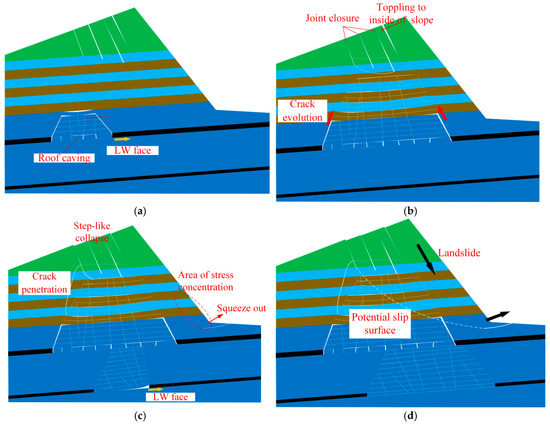 - The instability evolution of the slope under underground repeated mining disturbance can be divided into four stages as follows: roof caving and overlaying rock subsidence, joint rock toppling, fracture penetration, and slope toe shearing and slope slipping.