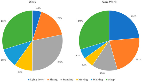 Physical behaviors were quantified using direct measurements with an accelerometer (ActivPAL4, PAL Technologies Ltd., Glasgow, UK) positioned on the right thigh of the participants, using previously described procedures adapted to real-world settings [26]. The accelerometer measures triaxial acceleration at 20 or 40 Hz with 10-bit precision and stores data in a 64 MB internal memory. The output includes periods spent in work and non-work activities, where non-work consists of all activities outside the work environment. This study used only the thigh position to analyze and classify activities into lying down, sitting, standing, moving, and walking.