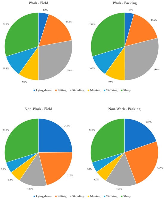 The main difference between the total sample during work and non-work periods lies in the behaviors of lying down, sitting, and standing. During the non-work period, the total sample spent significantly more time lying down (23.5%) compared to the work period (4.8%). Additionally, the total sample spends more time sitting during the non-work period (22.1%) than during the work period (17.0%). Conversely, during the work period, the sample spends more time standing (28.2%) than the non-work period (13.8%). Therefore, during the non-work period, individuals spend more time in sedentary behaviors (lying down and sitting) and less time standing compared to the work period. It is important to note that the results in the field and packing samples are similar in both work and non-work perspectives, with no significant differences between the job roles for all behaviors. Figure 2 illustrates the relationship between field and packing during work and non-work periods. Thus, subsequent analyses will not consider the differentiation between workers in the field and packing sectors.