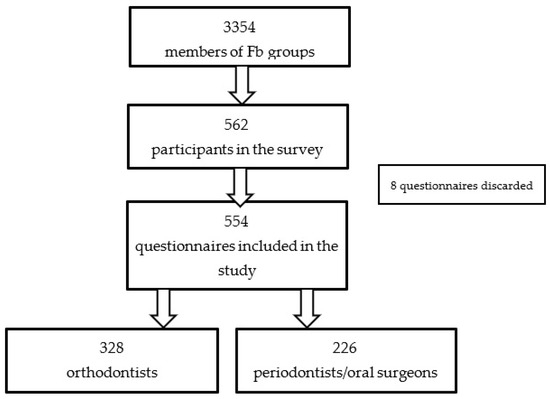 A total of 562 dentists, among whom 334 were orthodontists and 228 were periodontists/oral surgeons, participated in the study. Taking into account the total number of members of the Facebook groups included in the study, which was 33,554, the response rate was about 16%. Eight out of 562 questionnaires were discarded due to incomplete information. Hence, the remaining 554 responses were considered for further analysis (Figure 1).