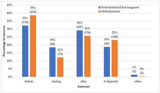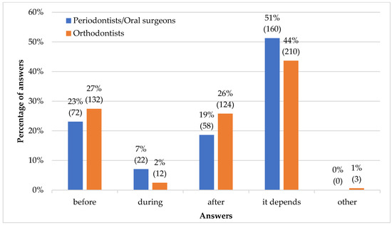 The majority of periodontists/oral surgeons’ answers (51%) and the most significant proportion of orthodontists’ answers (44%) indicated that the ideal timing of soft tissue augmentation is dependent on each specific case. Only 7% of periodontists/oral surgeons’ answers and 2% of orthodontists’ answers were that soft tissue augmentation should be performed during orthodontic treatment (Figure 3).