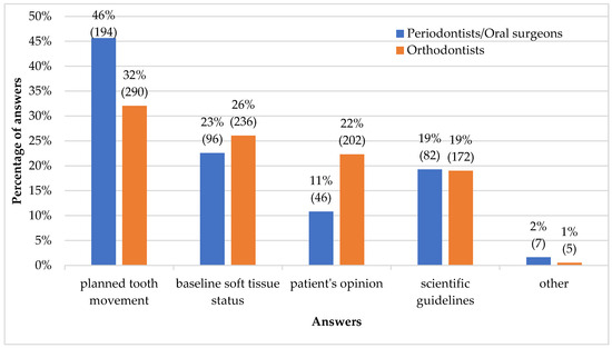 Periodontists/oral surgeons pinpointed “planned tooth movement” as the most important factor determining clinical decision-making (46% of answers), followed by the “baseline soft tissue status” (23%) and by “scientific guidelines” (19%). By the same token, orthodontists deemed “planned tooth movement” to be the most important factor affecting their decision-making (32%), followed closely by the “baseline soft tissue status” (26%) and by the “patient’s opinion on esthetics, hypersensitivity, and discomfort” (22%). The remaining doctors who selected “other” (2% of periodontists/oral surgeons and 1% of orthodontists) mentioned factors such as occlusal trauma, parafunctions, or the maintenance of oral hygiene (Figure 4).