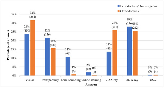 Roughly a third of the periodontists/oral surgeons surveyed used “3D radiological examination: cone-beam computed tomography” (28%) to evaluate soft and hard periodontal tissues. A smaller proportion indicated that they used the “visual method” (24%) or “gingival transparency using a periodontal probe” (22%). The most significant proportion of orthodontists surveyed preferred the “visual method” (32%), followed by “2D radiological examination: panoramic X-Ray, cephalometric X-Ray” (26%), and by “3D radiological examination: cone-beam computed tomography” (25%). The least popular methods of all the surveyed dentists were “ultrasonographic measurement” and “staining with iodine solution” (Figure 5).