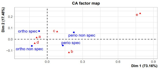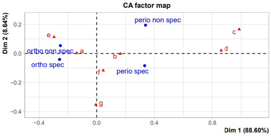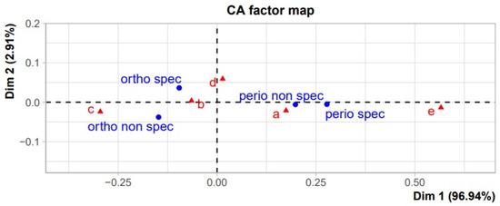 MCA is a multi-feature method that allows for the visualization of the relationship between the answers provided, and the groups of respondents involved, using a biplot chart. This allows for more transparent and unambiguous inferences, expanding the possibilities of interpreting survey research in relation to classical methods. The multiple correspondence analysis demonstrated differences in the answers between the periodontists/oral surgeons and orthodontists with or without specialization. The abbreviation “perio spec/non spec” on the plots is used for the group of periodontists/oral surgeons with/without specialization and “ortho spec/non spec” is used for the group of orthodontists with/without specialization.