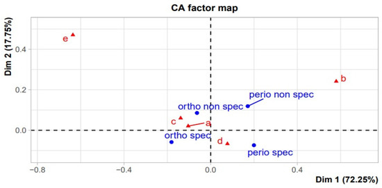 The MCA indicated that periodontists/oral surgeons more frequently chose answers b and c to question 3, whereas orthodontists chose a and d more frequently (Figure 6). Having a specialization did not influence the answers (the red triangles are close to each other). We observed no relationship between the specialization and the answer e given in response to question 3.