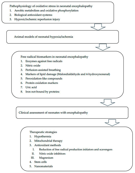 Our review is organized as follows: (1) the basics of the pathophysiology of oxidative stress in NE, (2) evidence from animal models of hypoxia/ischemia, (3) evidence of free radical biomarkers in NE, (4) a clinical assessment of neonates with encephalopathy, and (5) a summary of the latest research in the treatment options in NE (Figure 1).